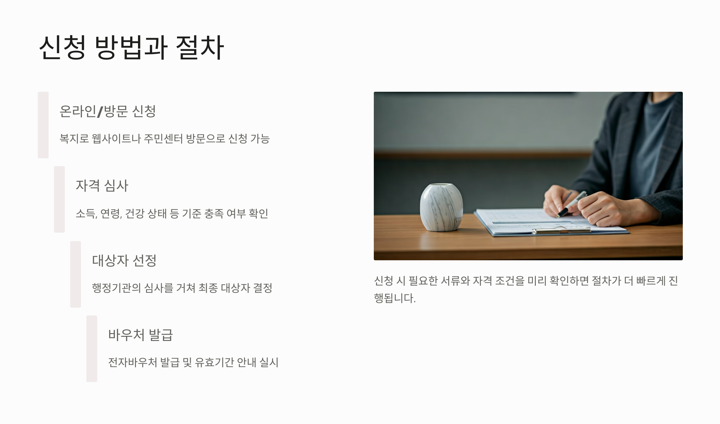 복지 바우처는 주민센터, 복지로(www.bokjiro.go.kr), 정부24(www.gov.kr) 등에서 손쉽게 신청할 수 있어요.