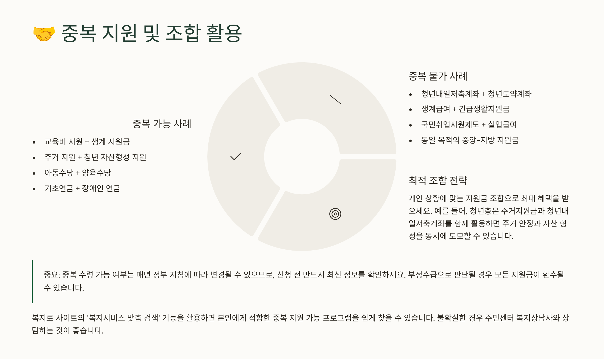 📍 **꿀팁 1: 중복 신청 가능한 항목 찾기** 예를 들어 청년은 청년내일저축계좌 + 청년월세지원 + 청년도약계좌를 동시에 신청할 수 있어요.