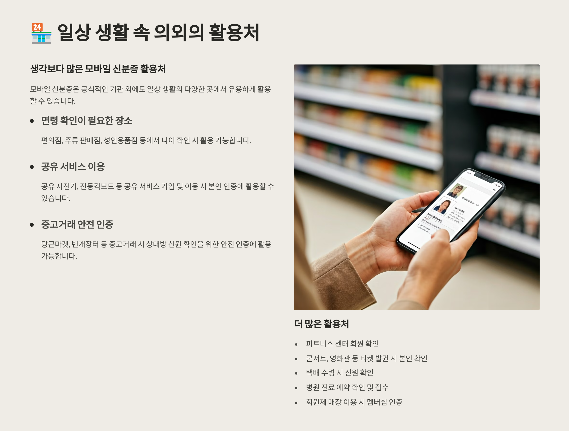 예를 들어 대학교 시험장, 공항, 은행 외에도 편의점이나 병원 접수창구에서까지도 모바일신분증이 통용되고 있다는 사실, 꽤 놀랍죠? 이런 정보는 막상 필요할 때 찾기 어려워요.