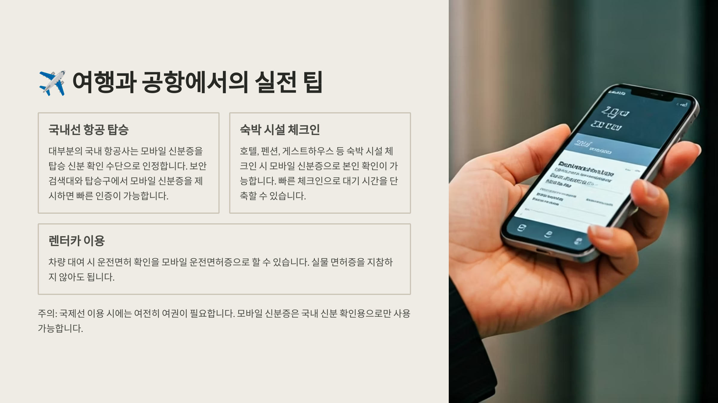 실제로 제주도나 강릉 등 관광지에서 차량 렌트할 때 모바일로 운전면허 확인이 가능해졌고, 여권 없이 국내 숙소 입실도 가능해진 사례가 점점 늘고 있어요.