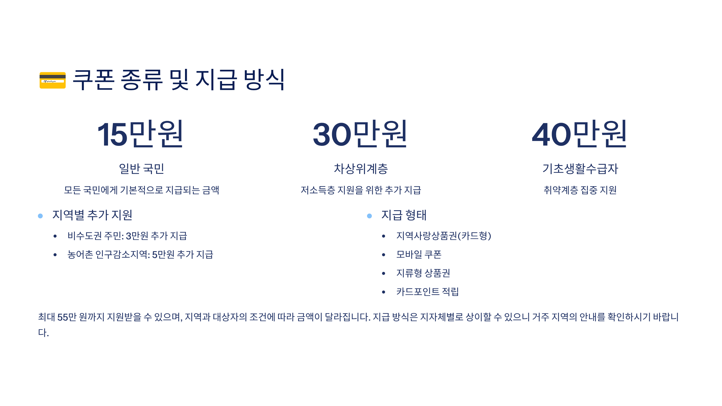📌 본 문서는 2025년 8월 기준 행정안전부 민생회복 소비쿠폰 공식 자료를 기반으로 작성되었으며, 정책 변경 시 실제 조건과 다를 수 있어요. 반드시 행정안전부 공식 홈페이지 또는 각 카드사·지자체 공지사항을 통해 최신 정보를 확인해 주세요.