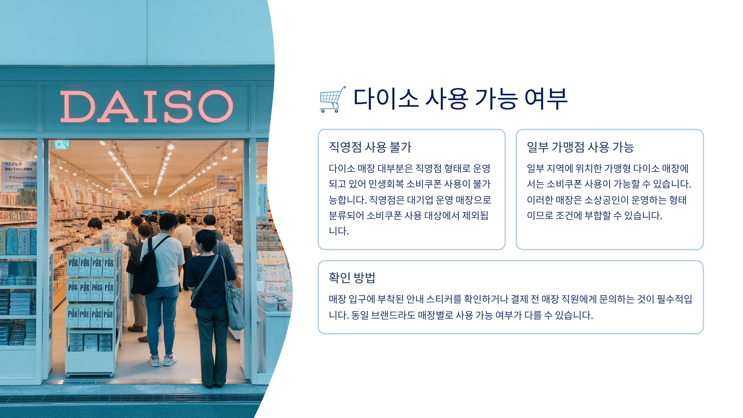 특히 다이소처럼 프랜차이즈 매장은 '직영점' 여부에 따라 사용 가능 여부가 달라질 수 있답니다.