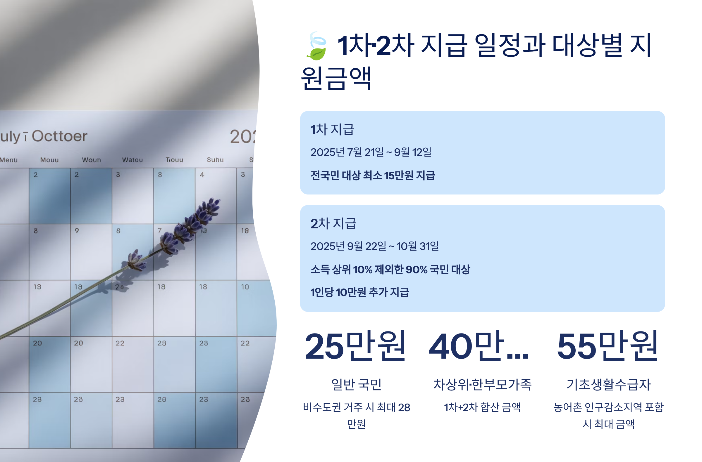 1차 지급을 받은 분들도 2차 신청을 별도로 해야 하며, 소득 상위 10%를 제외한 모든 국민이 대상입니다. 특히 기초생활수급자와 차상위계층은 최대 55만원까지 받을 수 있어 실질적인 생활비 부담 완화가 기대됩니다.