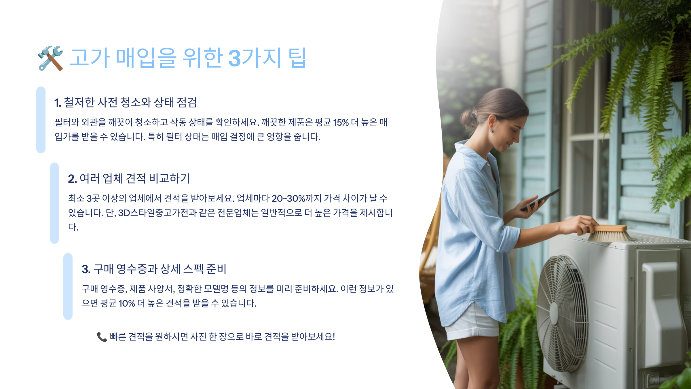 만약 삼성·LG 제품을 사용 중이고, 실외기까지 포함된 상태라면 지금이 팔기 가장 좋은 타이밍이에요. 여름 끝물에 수요는 남았고, 신제품 출시 전에 처리하고자 하는 사람들이 많아지는 시즌이거든요. 🌤️