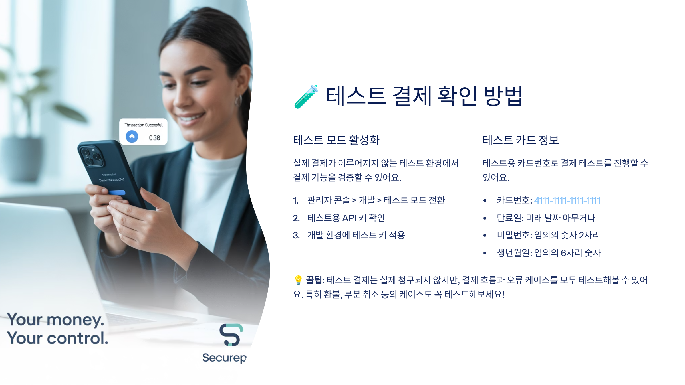 결제수단을 모두 설정했으면, 본격적인 실서비스 전 반드시 테스트 결제를 진행해봐야 해요. 실제 결제가 아니라 모의 결제 환경에서 작동하는지 확인하는 과정인데요. 이걸로 오류나 누락된 설정을 미리 잡을 수 있어요. 🧪