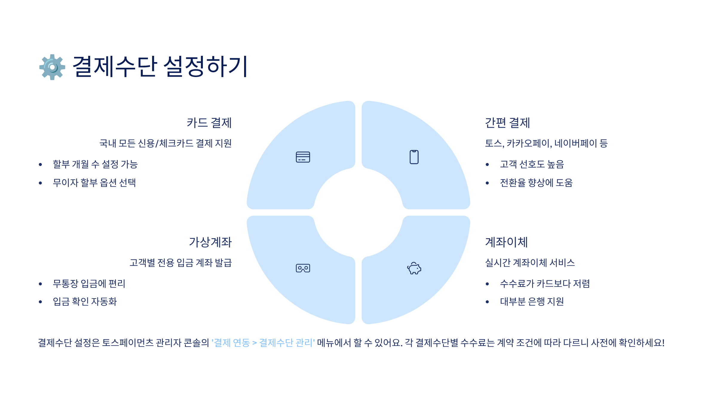 토스페이는 다양한 결제수단을 지원하니, 가능하다면 여러 수단을 동시에 설정해 두는 걸 추천해요. 고객 결제 성공률도 높이고, 상황에 따라 수수료 절감도 가능하니까요.