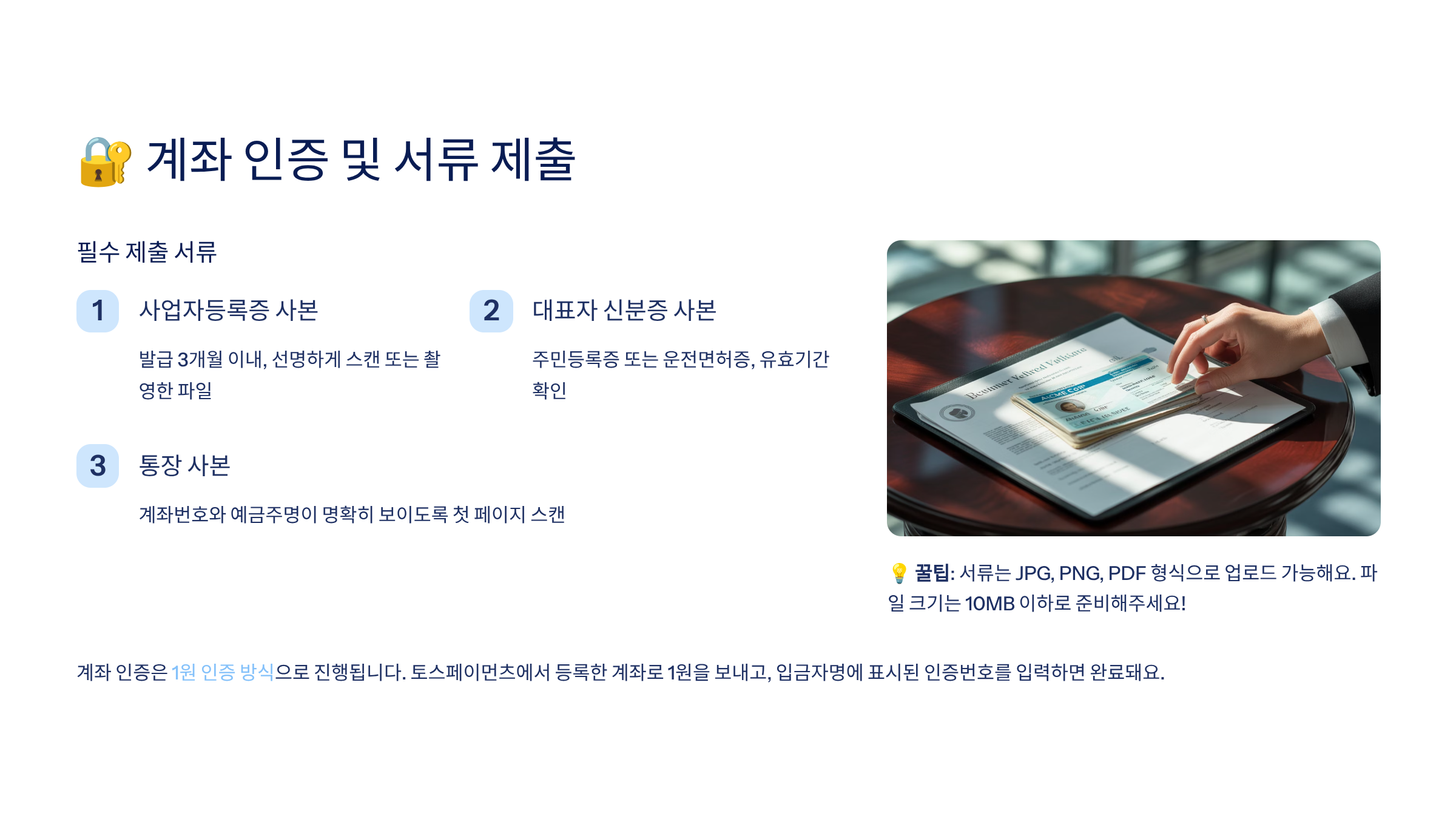사업자 정보 입력이 끝났다면, 다음 단계는 정산 계좌 인증이에요. 이 계좌는 실제 결제 대금이 입금될 통장이기 때문에 반드시 대표자 명의여야 해요. 혹시 법인이라면 법인 명의 계좌를 등록해야 하며, 공동 대표일 경우 별도 서류가 요구될 수도 있어요. 🏦