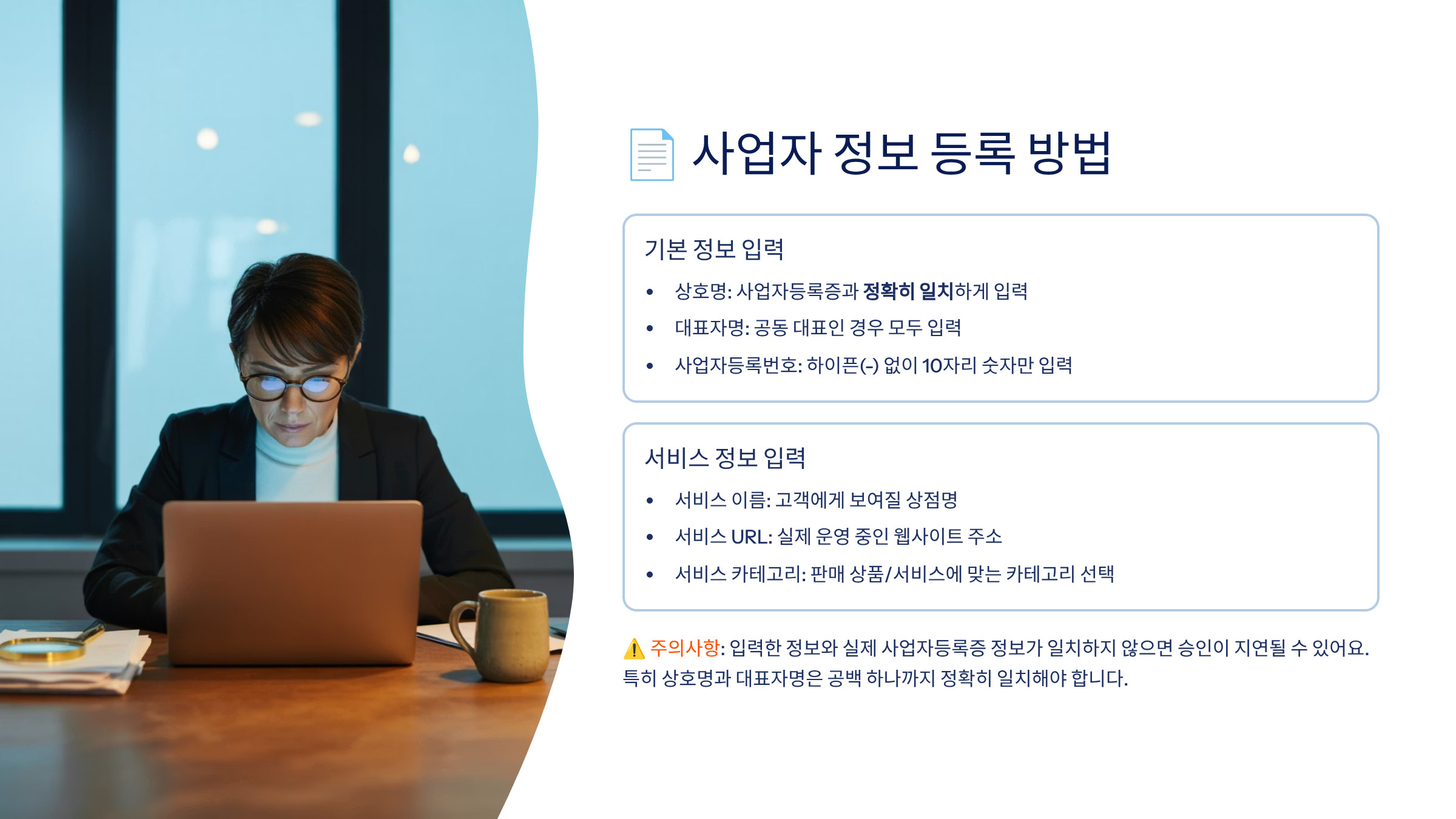 사업자 정보는 나중에 변경도 가능하지만, 심사 승인에는 영향을 줄 수 있으니 최대한 정확하게 입력해주세요.