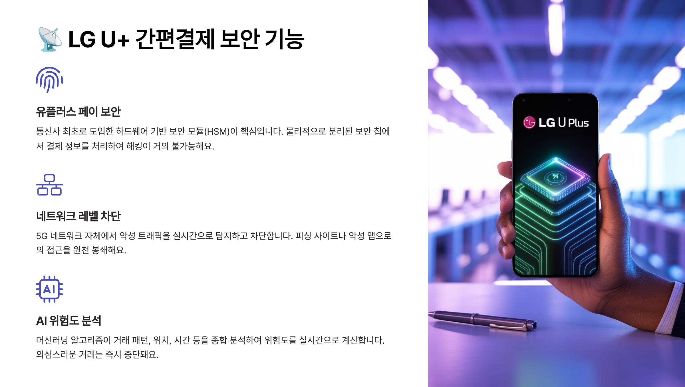 또한 LG U+는 '사기 결제 감지 시스템'이라는 AI기반 필터링 기술을 운영해요. 사용 패턴과 다른 결제가 감지되면 자동으로 차단하거나 보류시키는 기능이 작동돼요.