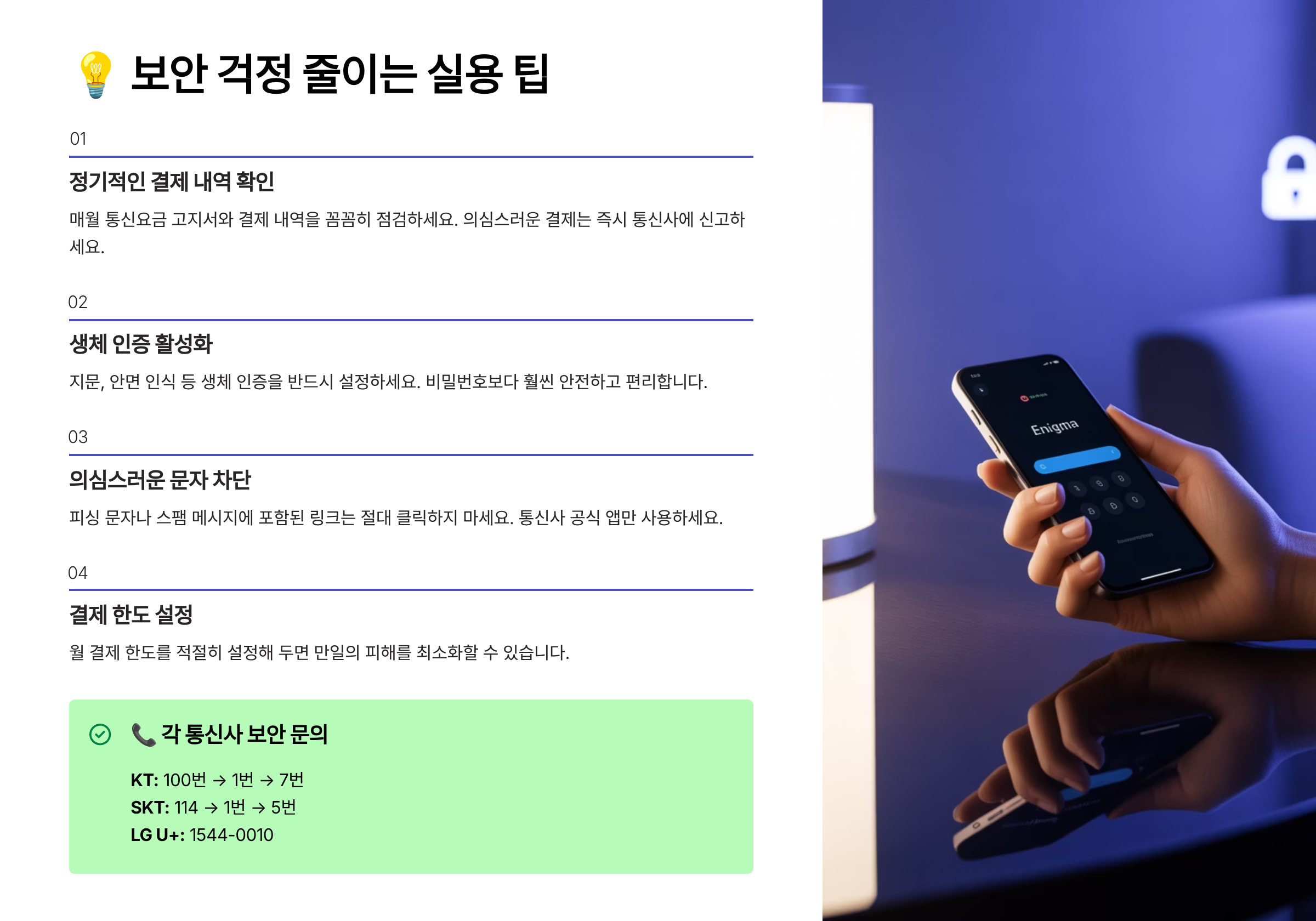 통신사들이 제공하는 간편결제 보안 기능은 생각보다 다양하고, 사용자 설정에 따라 충분히 막을 수 있는 기능도 많아요. 아래에서 하나씩 확인해볼게요! 👇