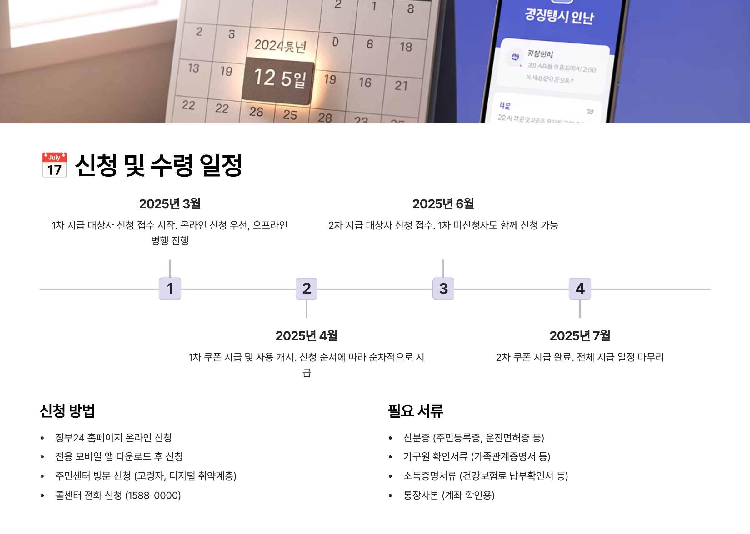 2025년에는 1차와 2차로 나눠 단계적 지급이 이루어지고 있으며, 정책 명칭은 같지만 세부 내용은 차이가 있어요. 1차는 기본 지원, 2차는 추가 지원이라는 구조예요.