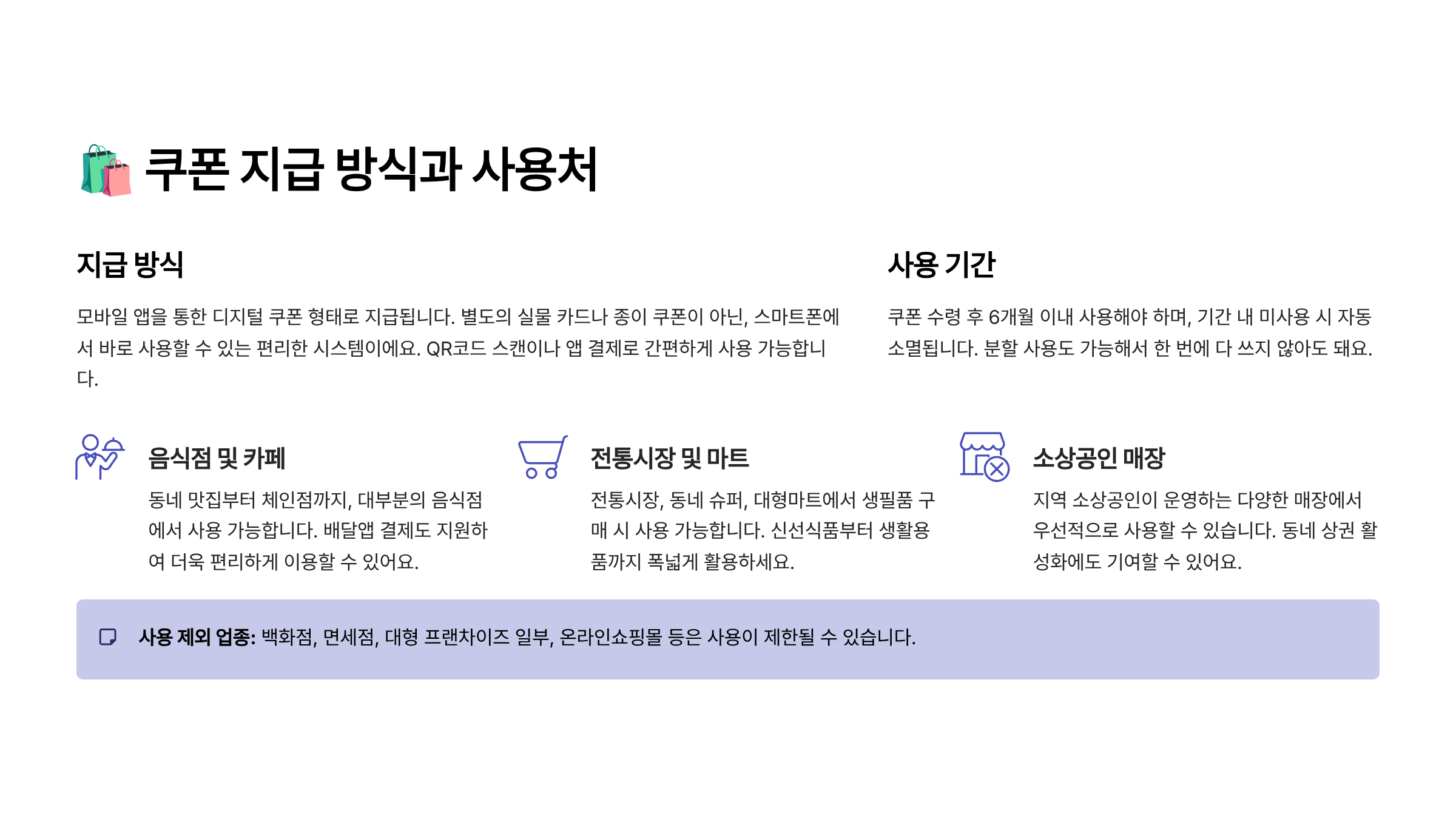 지역 내 가맹점에서만 사용 가능한 모바일 또는 지류 상품권으로 지급돼요. 앱 또는 오프라인으로 수령해요.