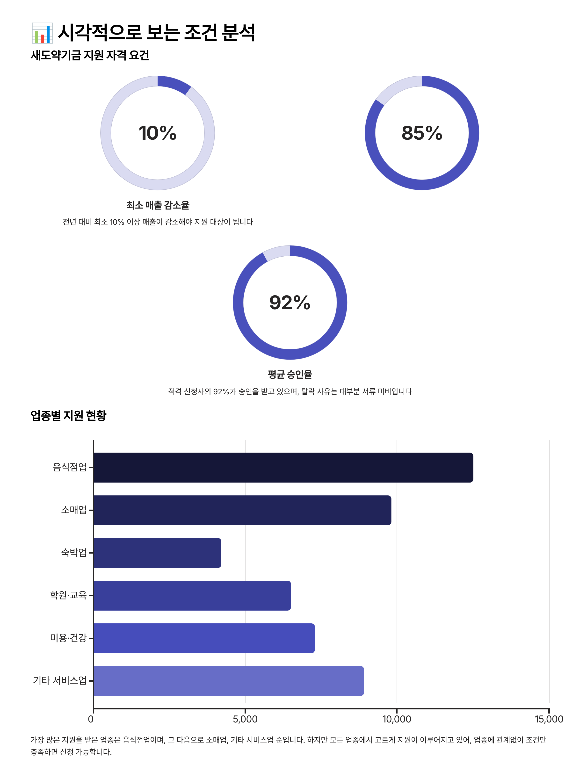 정리하자면, 새도약기금 자격조건은 단순히 ‘사업 중’ 여부만이 아니라, ‘매출 감소 증빙’, ‘업종’, ‘세금 신고 이력’의 3박자가 필요하다는 점이에요.