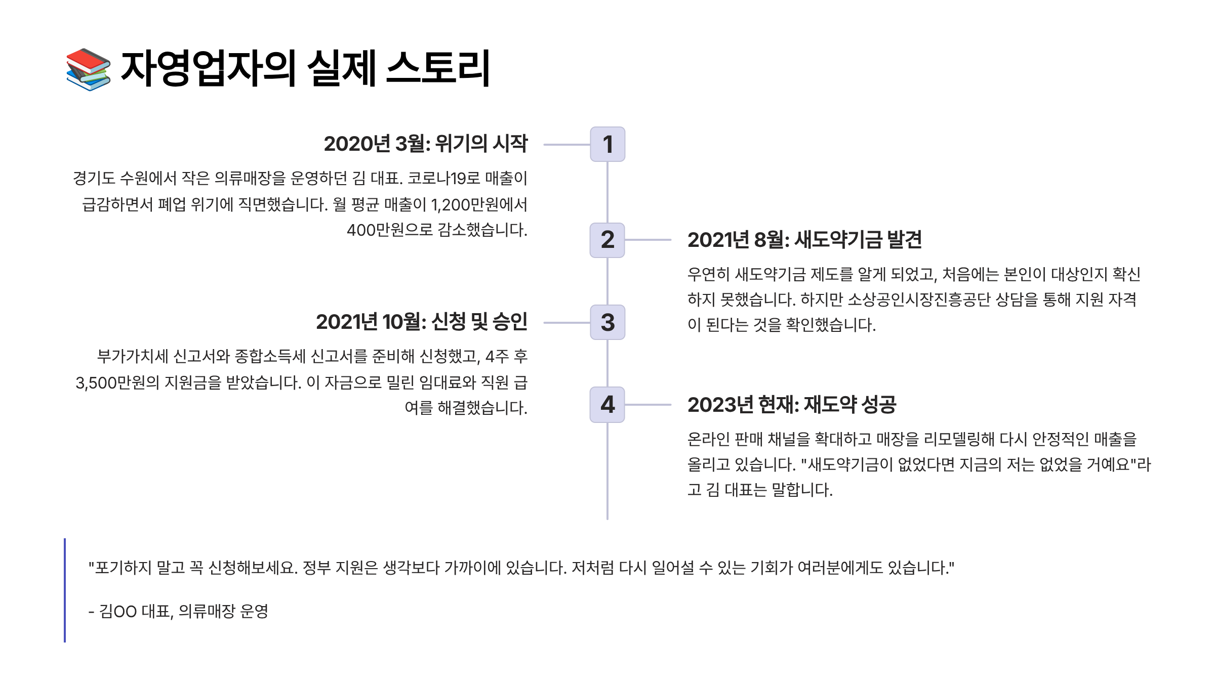 지원 조건이나 수치는 머리로는 이해되지만, 실제 경험담을 들어보면 공감이 훨씬 쉽게 돼요. 여기 소개하는 세 명의 자영업자는 모두 다른 상황에서 새도약기금을 통해 도움을 받았어요.