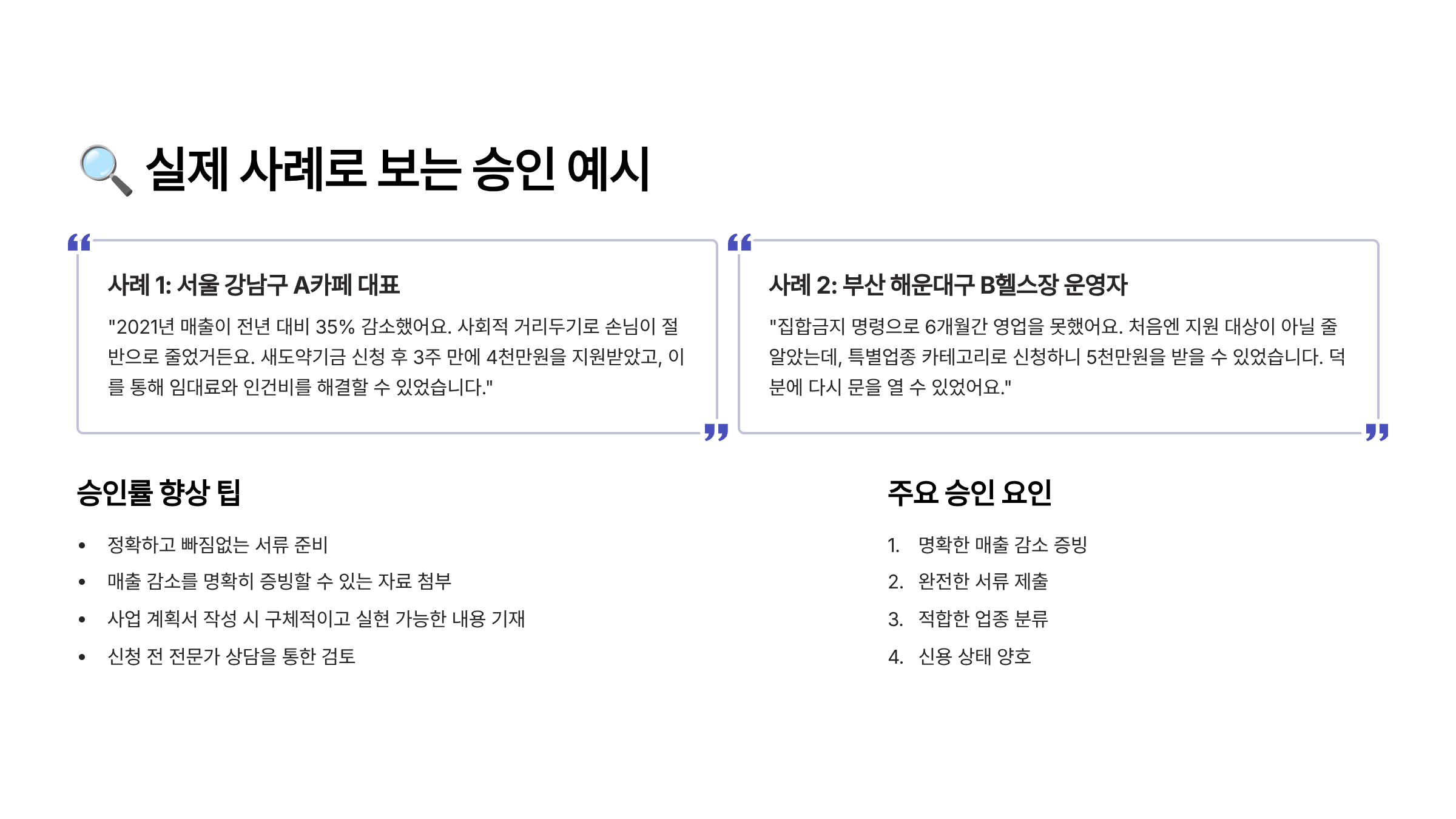 자영업자들이 공통적으로 말하는 포인트는 ‘정보를 놓치지 말 것’, ‘지원 일정에 맞춰 빠르게 대응할 것’, ‘지역 창구에 도움을 요청할 것’이에요. 이 세 가지를 실천한 분들이 대부분 승인받았어요.