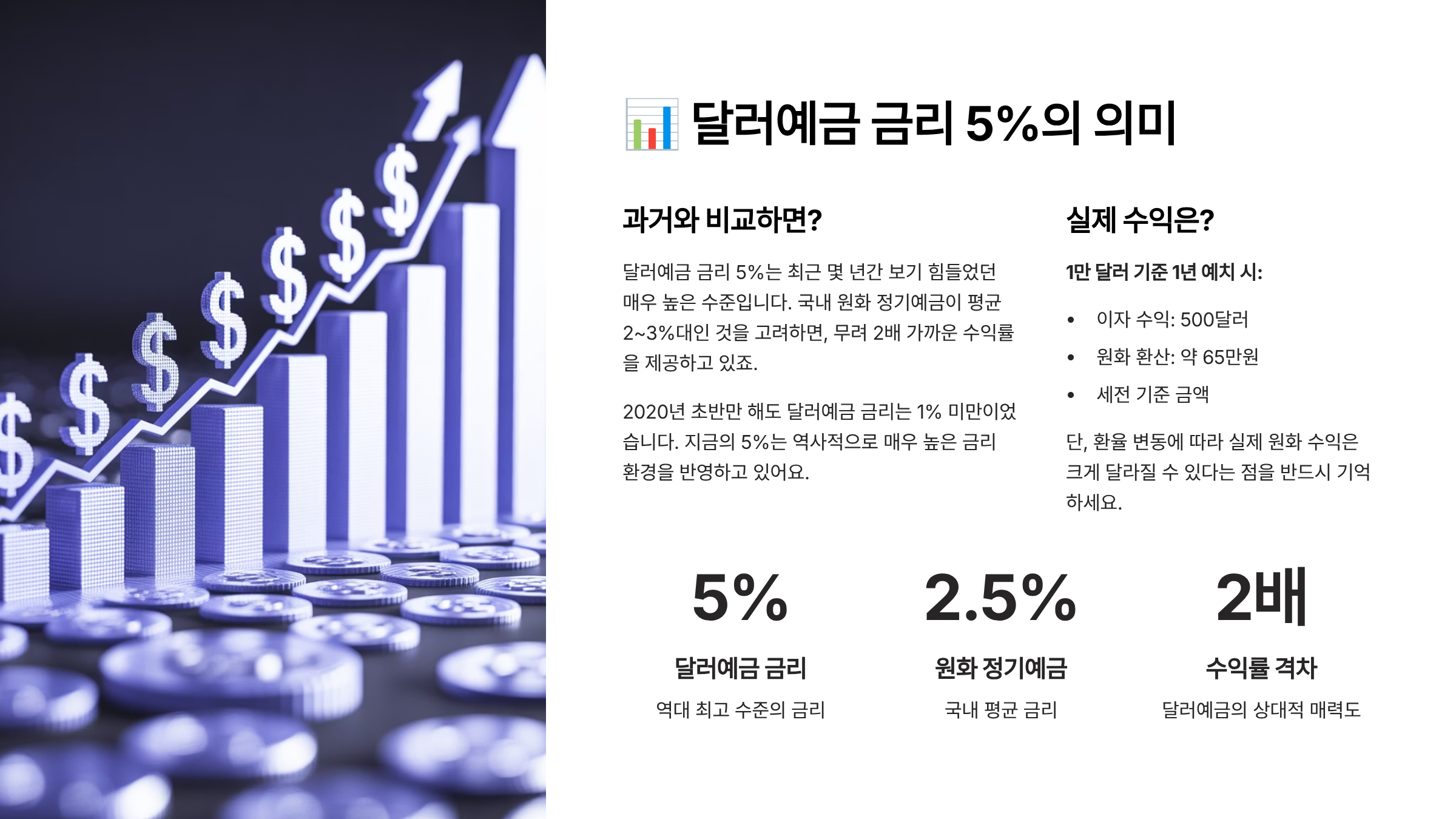 달러예금 금리가 5%라는 건 과거에는 보기 힘든 매우 높은 수준이에요. 일반적으로 국내 원화 정기예금 금리가 2~3%대인 걸 감안하면, 무려 2배 가까운 수익률이죠. 특히 예금처럼 안정적인 상품에서 이런 금리가 나온다는 건 투자자 입장에서 매우 매력적으로 보일 수밖에 없어요.