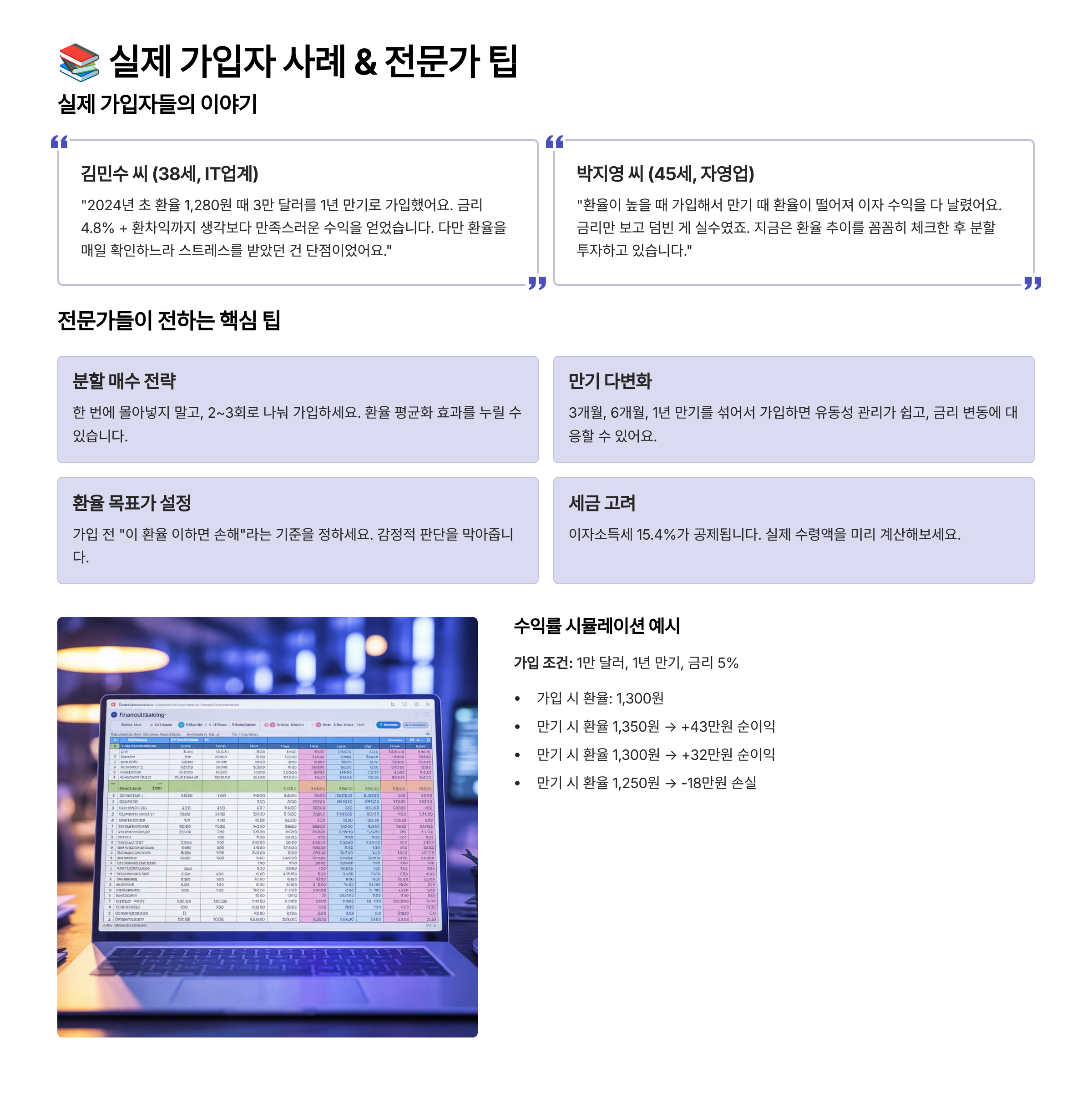 달러예금은 이론만 보고 결정하긴 어려워요. 그래서 실제로 가입한 사람들의 경험을 보는 게 중요해요. 지금부터는 2024년 하반기부터 2025년까지 달러예금을 가입한 5명의 생생한 사례를 통해 전략과 결과를 살펴볼게요. 👇