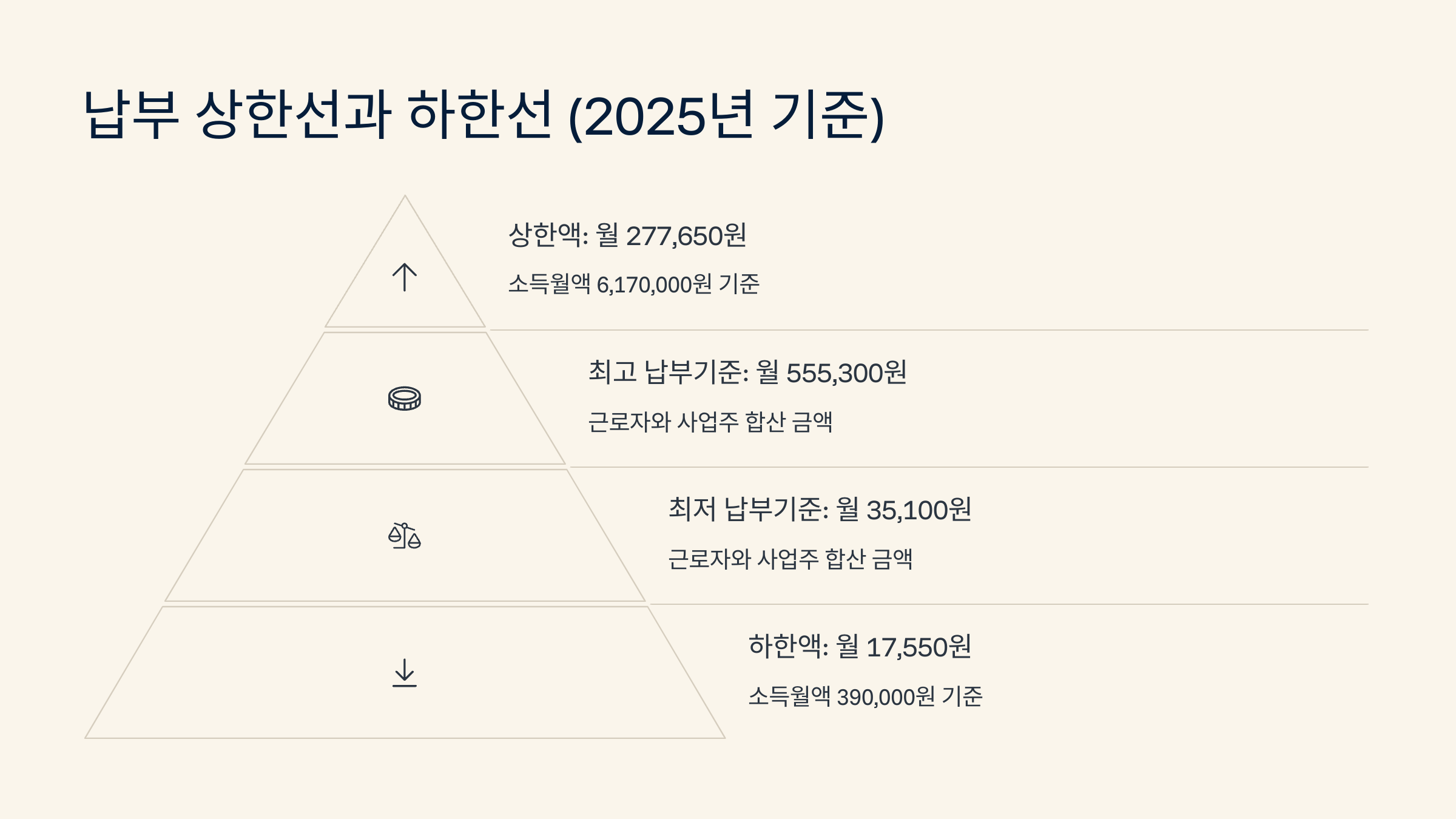 국민연금은 무조건 소득의 9%를 낸다고 해서 무한정 오르지는 않아요. 매년 ‘납부 상한선’과 ‘하한선’이 정해지기 때문에 일정 금액 이상부터는 더 이상 보험료가 올라가지 않아요.