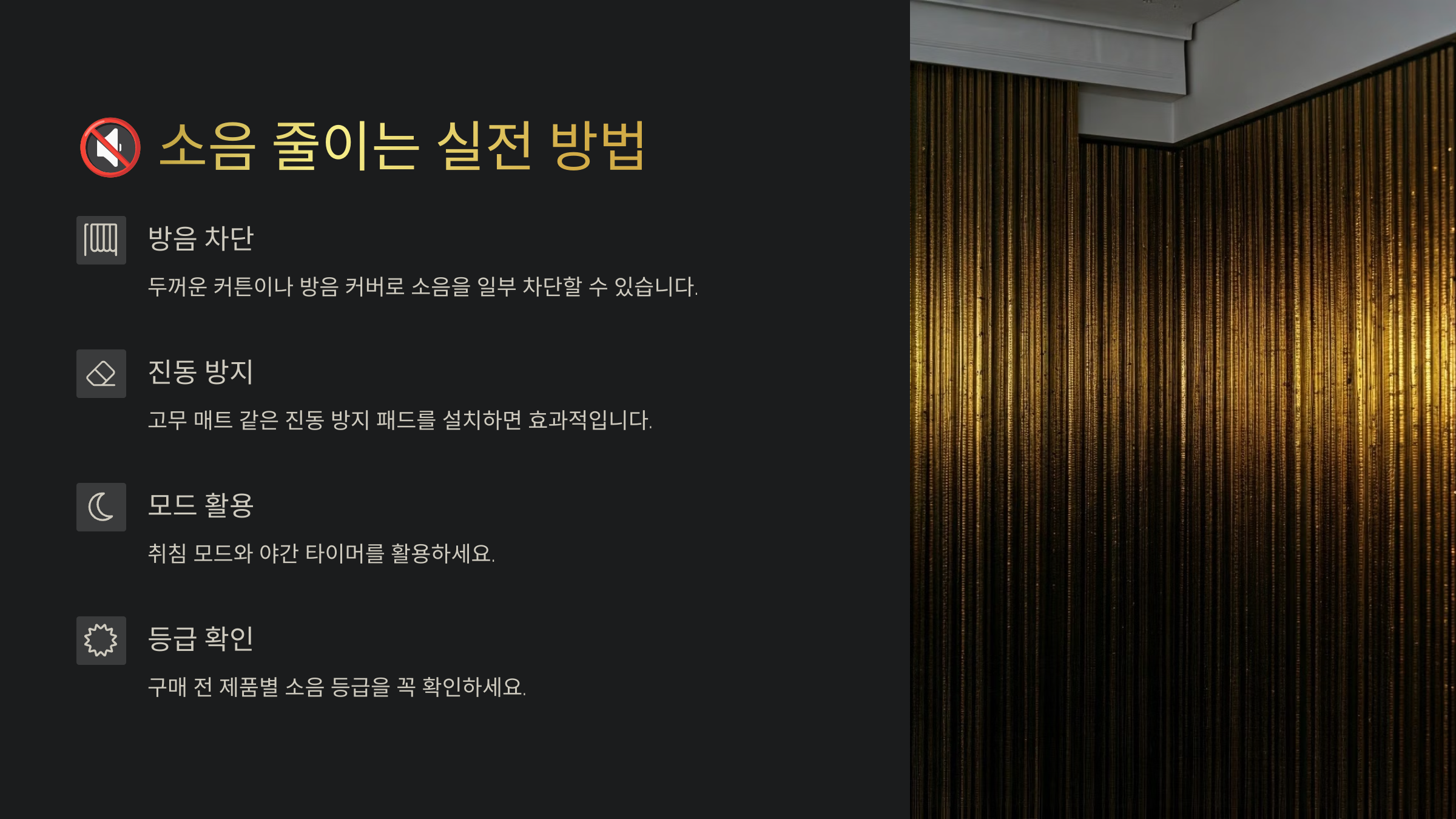 하지만 소음을 줄이는 방법도 있어요. 실제로 이 방법들만 써도 체감 소음이 30% 이상 줄어든답니다.